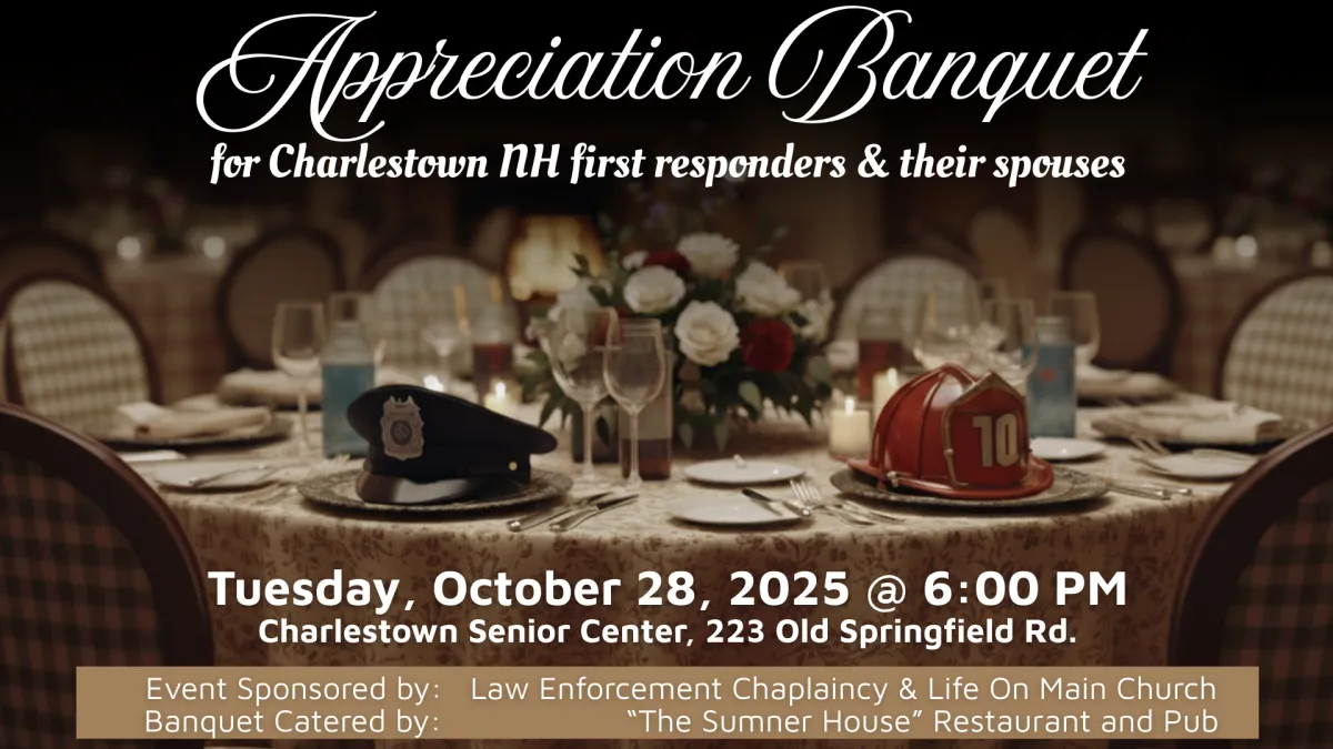 This event is RSVP and limited to law enforcement officers, dispatchers, firefighters, and EMTs that serve the town of Charlestown, NH and a spouse/guest. This takes place on National First Responders Day and is our way of saying "Thank You for all you do. This is banquet is provided by the law enforcement chaplaincy of Charelstown and hosted/sponsored by Life On Main Foursquare Church. The meal is being catered by The Sumner House on Main Street in Charlestown, NH.